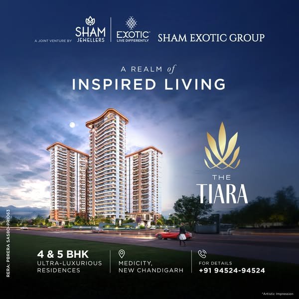 o 8000 sq. ft. Designed with abundant natural light, premium finishes, and world-class amenities—including a modern fitness center, infinity pool, and landscaped gardens—The Tiara offers an unparalleled lifestyle of elegance and comfort in New Chandigarh.